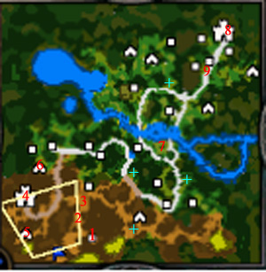 Partez ensuite en direction du nord, en faisant éventuellement un détour par la ville pour prendre des troupes supplémentaires, pour atteindre la scierie (6). Maintenant le ravitaillement principal de la ville est assuré. Explorez les alentours en prenant bien soin de fouiller tous les recoins. Les zombies sont les adversaires les plus dangereux car les plus résistant. Dans les coffres preferez l’experience à l’or. En particulier ne ratez pas les lieux à upgrade définitive (tour de marletto, camp de mercenaires…) les bonus qu’ils vous confèrent sont définitif et valables pour toute la campagne. Fouillez les lieux sans soucis et en prenant régulièrement des renforts (en ville ou dans les demeures extérieures), vos archers vous confèrent une force de frappe suffisante pour abattre tous les monstres sans pertes (ne bougez pas vos fantassins et paysans, laissez l’ennemi approcher). L’observatoire (7) vous révélera la position de Frênebois (8). De l’autre coté de la rivière se trouvent plusieurs artefacts qui vous conféreront quelques bonus. Avant l’assaut final sur frênebois un groupe de griffons se joindra à vous (9). Utilisez-les pour passer par-dessus la muraille du château ennemi et neutraliser les archers le plus vite possible.