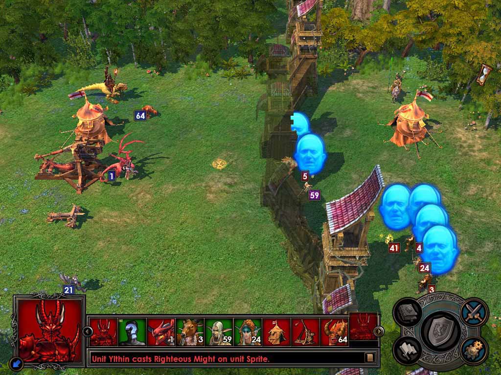 La grande nouveauté concerne également les capacités uniques de chaque faction. Calqué sur le principe de la nécromancie que tout le monde connaît, chaque race se voit maintenant affubler d'une ou deux spécialités uniques. Ainsi les troupes du Haven pourront riposter plus fort tandis que l'Academy construira des artefacts pour ses créatures et ainsi de suite. Ces capacités instaurent une grande stratégie et peuvent devenir décisive à niveau élevé. Ainsi pour l'Inferno le « gating » qui permet d'appeler des renforts d'unités des enfers en un pourcentage de 30% du stack invoquant permettra d'invoquer des créatures level 1 et 2 au premier niveau, puis par la suite 3,4, et ainsi de suite. Le stade suprême nécessitant beaucoup de prérequis permettra d'invoquer les renforts instantanément n'importe ou sur le champ de bataille. Assez pratique pour bloquer les archers ennemis ^^.